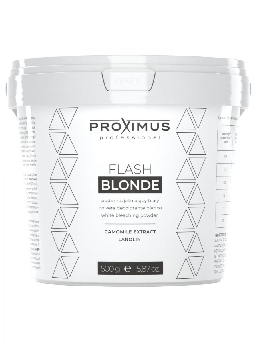 Biały, bezpyłowy rozjaśniacz Proximus jest idealny do dekoloryzacji oraz do rozjaśnienia włosów podczas pracy technikami manualnymi (z tzw. "wolnej ręki"). Rozjaśnia włosy do 8 tonów. Wzbogacony o lanolinę i ekstrat z rumianku.