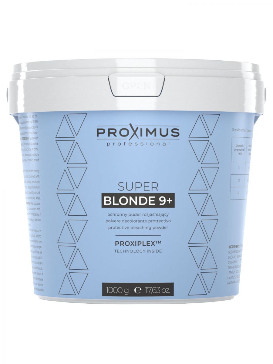 Niebiesko - fioletowy, bezpyłowy rozjaśniacz do włosów Proximus jest idealny do dekoloryzacji oraz do średniego i silnego rozjaśniania włosów. Rozjaśnia do 9 tonów. Wzbogacony o formułę ProxiPlex, która jednocześnie chroni wiązania mostków dwusiarczkowych w trakcie zabiegów, zmniejsza łamliwość włosów i ułatwia ich rozczesywanie.